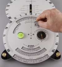 2: Instellen voor gebruik: 1. Stel de relatieve positie in uw tijdzone in met de bijgeleverde stel-schroevendraaier in het Timezone-venster. Bijvoorbeeld: Mijn coördinaten zijn 4.6° Oost en 52.0° Noord. Mijn tijdzone is CET en is GMT+1. Een tijdzone is 15° breed (24 tijdzones --> 24 x 15° = 360°). 2. Stel de zomertijd in het Zomertijd venster. 3. Draai de Datum-ring naar de huidige datum. Door het draaien van deze ring worden 2 verdere instellingen automatisch gedaan, n.l. de equatie-correctie en de verplaatsing van de analemmatische zonnewijzerplaat. De vertical gnomon correspondeert altijd met de datum in de Datum-ring. De equatie-correctie wordt automatisch verwerkt in de uiteindelijke tijdcorrectie van de zonnetijd naar de tijd in uw tijdzone 4. Stel het kompas in op de huidige magnetische deklinatie. (Als de zon schijnt en er een schaduw is dan kan de zonnewijzer ook op het Noorden worden gesteld door de zonnewijzer horizontaal te draaien totdat beide afleesschalen dezelfde tijd aangeven. De zonnewijzer moet dan wel op de juiste datum ingesteld zijn en horizontaal staan. Op deze wijze kunt u dus ook de lokale magnetische deklinatie vinden. 3: Gebruik van de zonnewijzer: Als de zonnewijzer goed staat ingesteld, horizontaal en op het noorden gericht dan geven beide schalen dezelfde zonnetijd aan. In het venster onder XII vind u het aantal uren en minuten dat bij de zonnetijd moet worden opgeteld of afgetrokken om de tijd in uw tijdzone te berekenen. In mijn voorbeeld is de datum 24 Maart en moet ik 47 minuten optellen bij de zonnetijd. B.v. als de zonnewijzer 10:45 aangeeft dan is de tijd op mijn horloge 10:45 + 00:47 = 11:32) 4: Afmetingen: lang = 42cm (16.5"), breed 25.5cm (10"), hoog: hangt af van de breedtegraad. 5: Constructie: De zonnewijzer heeft 5 interactieve lagen en is gemaakt van 2 and 3 mm hard Resopal, messing en roestvrij staal. Het Resopal is erg hard onbuigbaar. Er zijn 2 horizontale stelschroeven en 2 stelbare gnomons. De gnomons zijn bevestigd aan een arm, die de gnomon-draden onder spanning houden. de arm kan worden neergeklapt voor plaatsing in een meegeleverde houten kist. De wijzerplaten zijn geconstrueerd in een zelf geschreven computerprogramme en CNC gegraveerd en uitgefreesd. 6: Gnomon afstelling: De 2 gnomons kunnen individueel worden bijgesteld. De lengte verandert door het draaien van de stelschroef in de bodemplaat. Houd er rekening mee dat een lengteverandering van de ene gnomon een verandering in de hoek van de andere gnomon veroorzaakt. Bij aflevering zijn beide gnomons juist afgesteld en hoeft hier niets veranderd te worden. 7: Opties: De tekst kan in uw eigen taal. Eigen tekst (b.v.: uw naam, uw woonplaats of naam van uw residentie of landgoed) 8: Meegeleverd: de zonnewijzer wordt geleverd in een houten kist (44 x 27 x 5 cm) (17.3" x 10.6" x 2"), Resopal gnomon afstel hoek, Resopal stel-schroevendraaier.