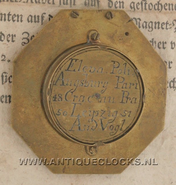 Augsburg zak-zonnewijzer (Sonnenuhr) in origineel etui met antieke gedrukte handleiding van Ludovicus Theodoris Müller. ca 1760 (magnetische declinatie van ongeveer 18 graden). 56 x 59 mm