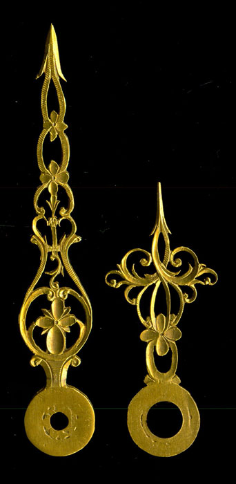 | € 130,- | Wijzerlengtes (hart naar top): minuut/uur: 67/40 mm. set Nr. 5, verguld. Prijs per set. | |