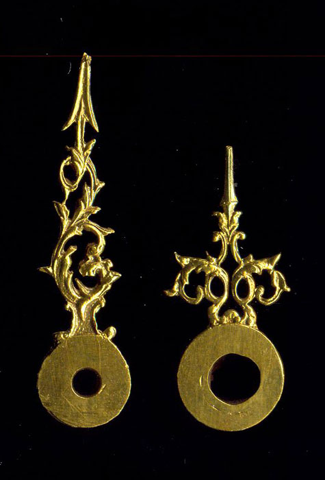 | € 75,- | Wijzerlengtes (hart naar top): minuut/uur: 23/16 mm, verguld. set Nr. 6. Prijs per set. | |