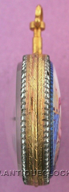 | SOLD | Pronk horloge met emaille wijzerplaat, lunette bezet met 'rhine'-steenjes en achterzijde met rijke emaille-beschildering ( kleine retauratie in blauwe rand) . Ongesigneerd uurwerk, Diameter 54 mm. | |